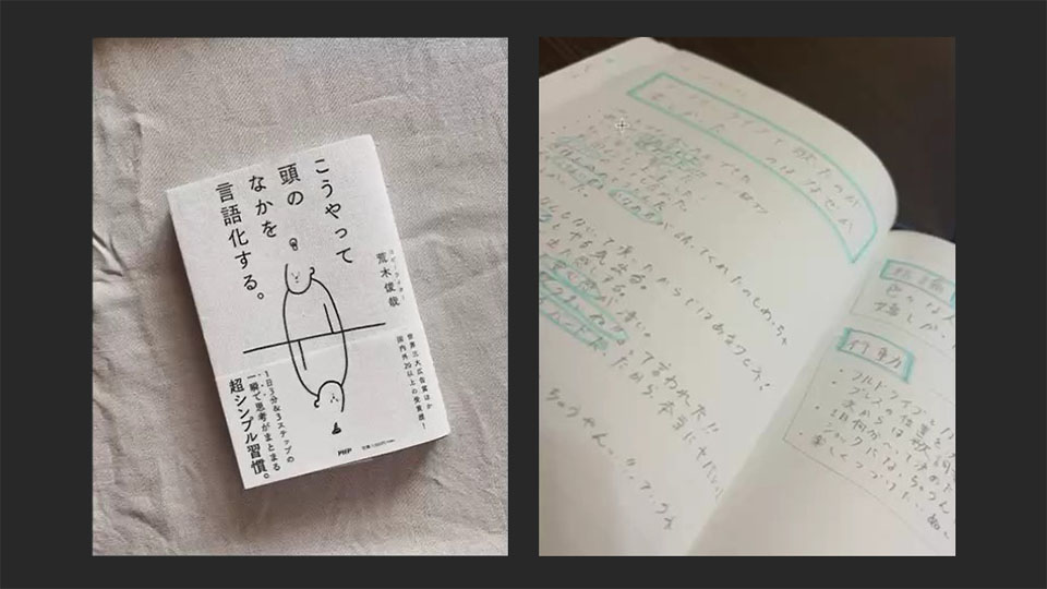 最近始めたことは、この本が個人的にすごく良くて、『こうやって頭の中を言語化する』っていうコピーライターの荒木俊哉さんが書かれた本なんですけど、私は物語とかシナリオを書きたいなっていう気持ちがあって。それがあまりうまくできないっていう話をいろんな人にしているなかで、父に「俺はそういうの分からないけど、この本が言葉に関する本で結構良かったから」って教えていただいて。この本を読んでめちゃくちゃ良かったのでみんなにおすすめなんです。