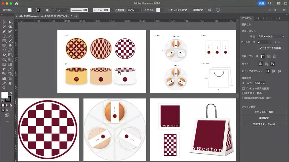 私は後期の授業で今作っているものです。3年前期の授業から引き続きで、自分が制作した架空のスイーツブランドのブランディングをさらに進めていこうということで、中身のディテールだったり、パッケージのデザインだったり、ショッパーの方の袋のデザインだったりっていうのを今突き詰めてます。全体的にこういう感じで販売していくっていうのを今定めてる感じです。