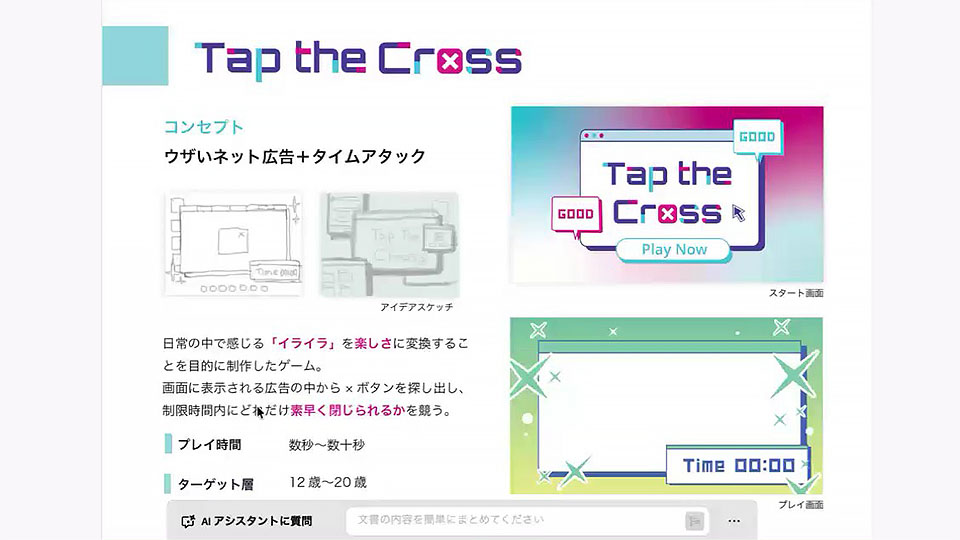 デザインがまだ固まってないので仮なんですけど、これがさっき言ってた作ってるゲームの説明です。題名が『タップザクロス』というゲームで、名前のとおりとにかく✕ボタンを押し続けるゲームになります。コンセプトが「うざいネット広告」と「タイムアタック」を掛け合わせたものになります。