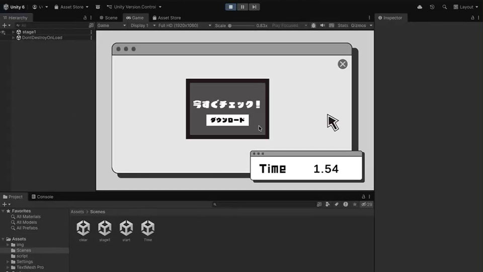 広告でイライラした感情から生まれました、このゲーム(笑)。画面が小さくて申し訳ないんですけど、ちょっと動かしてみます。こんな感じで、これもデザインが未完成で色が白黒なんですけど、ボタンを押すとどんどん画面が切り替わって、別の広告がどんどん新しく出てくるので、とにかく早く✕ボタンを押し続けるっていうものになります。最後に何秒でできたっていうのが表示されて、これでゲームをおしまいっていうゲームを作っています。